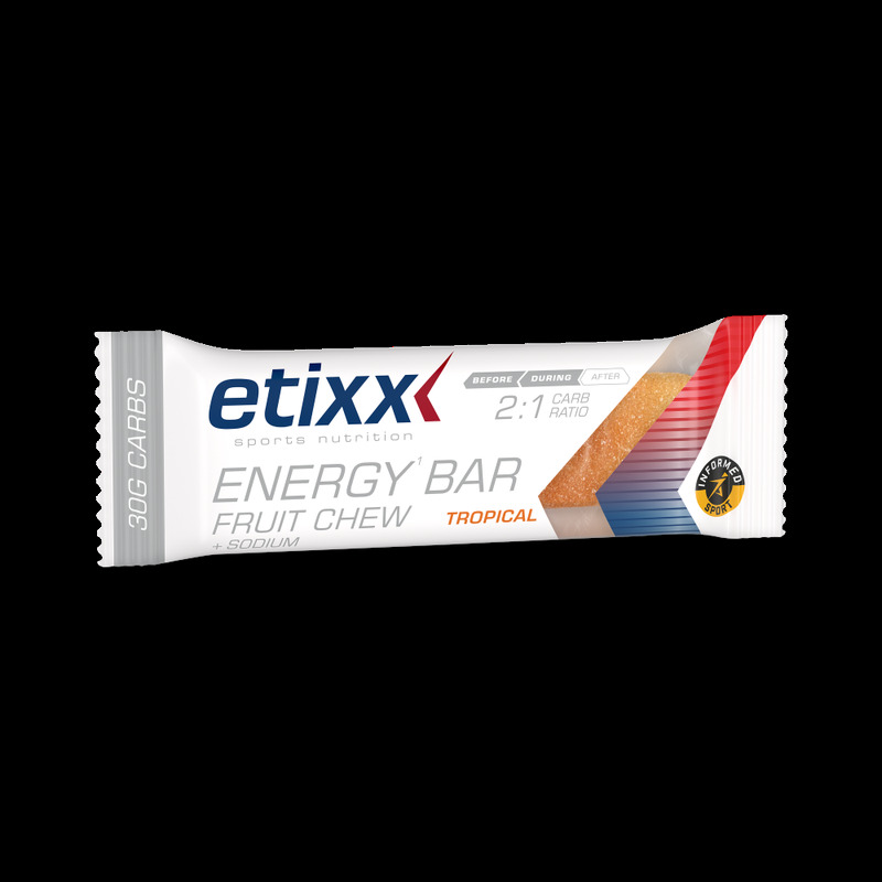 Etixx Energy Bar Fruit Chew obsahuje 30 g sacharidů v optimálním poměru 2:1 (glukóza:fruktóza) pro optimální vstřebávání sacharidů. Navíc obsahuje 100 mg sodíku na tyčinku.